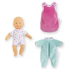 This set consists of a small 20 cm Mini Calin baby doll, blue pajamas and a pink sleeping bag, both equipped with hook-and-loop straps to make dressing and undressing easier.